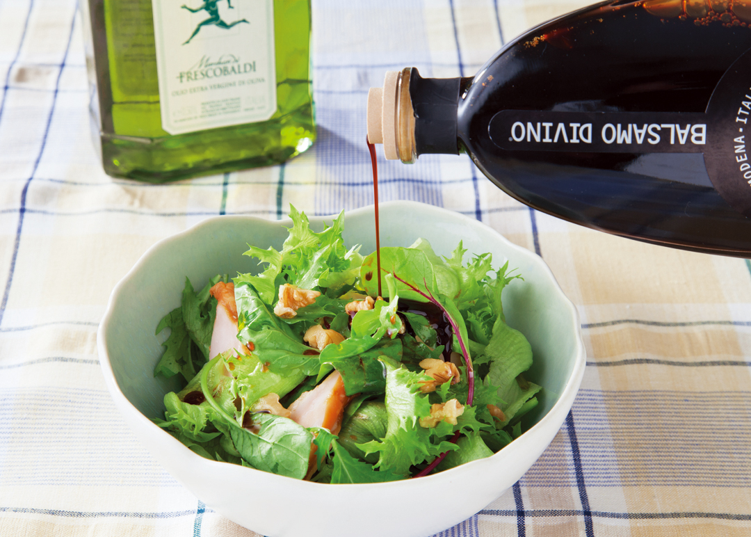 料理の仕上げに、バルサモ・ディヴィーノをごく少量かけるだけ。素材の味が引き立ち、コクと風味が加わって、おいしく仕上がります。肉や魚料理の仕上げにかけるとおいしいソースになります。